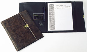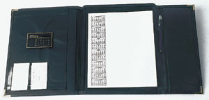 | BINDER FOLIO- EP 021/022 | Heat-sealed in richly finished vinyl with gussetted pocket, clear pocket for business cards, an 8" x 10" writing pad and a flap with lock and key. Available in the following styles: EP 022 Basic * EP 021 With pen, calculator and gilt corners. |